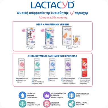 Τα σαπούνια με έντονο άρωμα ή τα αποσμητικά για την ευαίσθητη περιοχή είναι πιθανό να προκαλέσουν ερεθισμό και να αναταράξουν την ισορροπία του κόλπου. Διάλεξε το Lactacyd, το οποίο περιέχει συστατικά τα οποία εναρμονίζονται με τις ανάγκες του γυναικείου οργανισμού, διαφυλάσσοντας τη φυσική ισορροπία της ευαίσθητης περιοχής. Ένα από αυτά είναι το Βιολογικό L-Γαλακτικό Οξύ που βοηθάει την ανάπτυξη των ωφέλιμων βακτηρίων της κολπικής χλωρίδας.