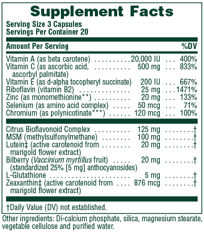 Περιγραφή: Προστασία των ματιών από τις εκφυλιστικές αλλοιώσεις των ελεύθερων ριζών, με λουτεΐνη (20 mg οι τρεις κάψουλες), ζεαξανθίνη, αντιοξειδωτικές βιταμίνες και μέταλλα, βιοφλαβονοειδή, MSM, Μύρτιλλο (Bilberry), Γλουταθειόνη. Υποαλλεργικό.