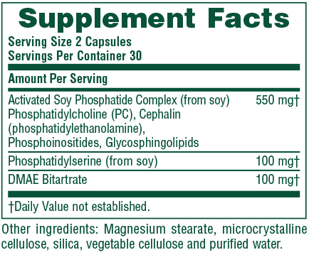 Περιγραφή: Ειδική φόρμουλα για τη βελτίωση των εγκεφαλικών λειτουργιών με φυσικές ουσίες που είναι συστατικά των νευρικών κυττάρων ή μετέχουν στην διαδικασία παραγωγής ορισμένων νευροδιαβιβαστών: Phosphatidylserine, DMAE (2-dimethylami-noethanol) και ενεργοποιημένα φωσφατίδια σόγιας (Phosphatidylcholine, Cephalin, Phosphoinositides, Glycosphingolipids).