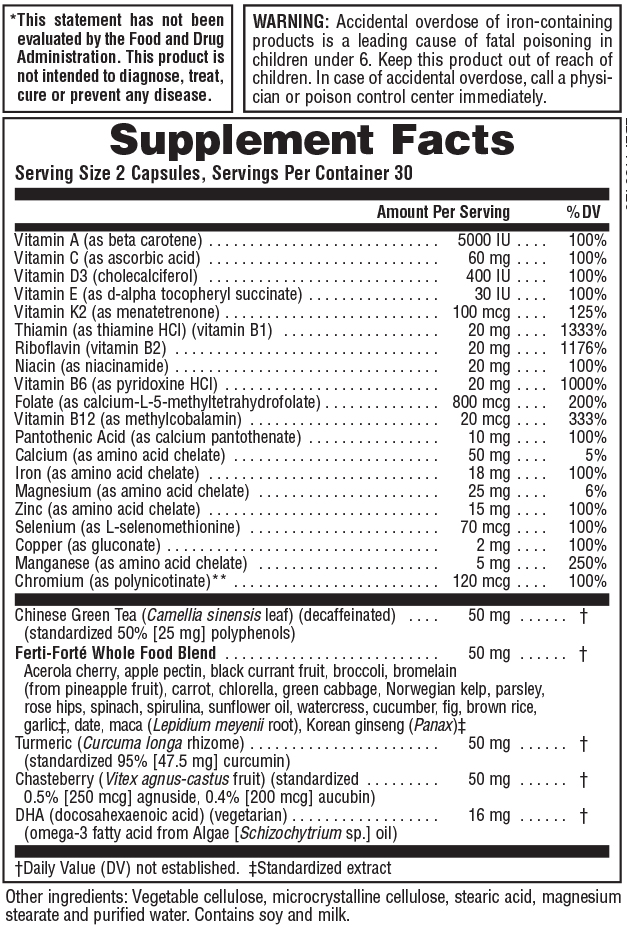 Περιγραφή: Φυσικό πολυβιταμινούχο συμπλήρωμα ειδικά σχεδιασμένο ώστε να παρέχει τη μέγιστη διατροφική υποστήριξη για τη σωστή λειτουργία του γυναικείου αναπαραγωγικού συστήματος. Συνδυάζει βιταμίνες, μέταλλα, ιχνοστοιχεία, αμινοξέα, ένζυμα, αντιοξειδωτικά και ειδικά βότανα, που βοηθούν στην ομαλή ορμονική λειτουργία και την αύξηση της γονιμότητας.