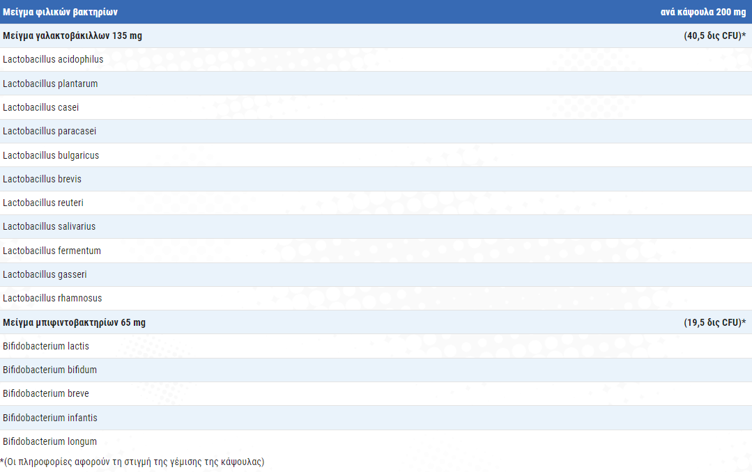 Βασικά συστατικά: μείγμα γαλακτοβάκιλλων (Lactobacillus acidophilus, Lactobacillus plantarum, Lactobacillus casei, Lactobacillus paracasei, Lactobacillus bulgaricus, Lactobacillus brevis, Lactobacillus reuteri, Lactobacillus salivarius, Lactobacillus fermentum, Lactobacillus gasseri, Lactobacillus rhamnosus), μείγμα μπιφιντοβακτηρίων (Bifidobacterium lactis, Bifidobacterium bifidum, Bifidobacterium breve, Bifidobacterium infantis, Bifidobacterium longum)