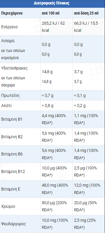 Συστατικά: νερό, συµπυκνωµένος χυµός σταφυλιού, συµπυκνωµένος χυµός παντζαριού, εκχύλισµα µορίνγκα, εκχύλισµα αγκινάρας, εκχύλισµα ταραξάκου, εκχύλισµα τσουκνίδας, εκχύλισµα πράσινου τσαγιού, χλωριούχος χολίνη, D-γλυκονικός ψευδάργυρος, οξική DL-άλφα τοκοφερόλη, υδροχλωρική πυριδοξίνη (βιταµίνη Β6), υδροχλωρική θειαµίνη (βιταµίνη Β1), ριβοφλαβίνη (βιταµίνη Β2), τριχλωριούχο χρώµιο, κυανοκοβαλαµίνη (βιταµίνη Β12).
